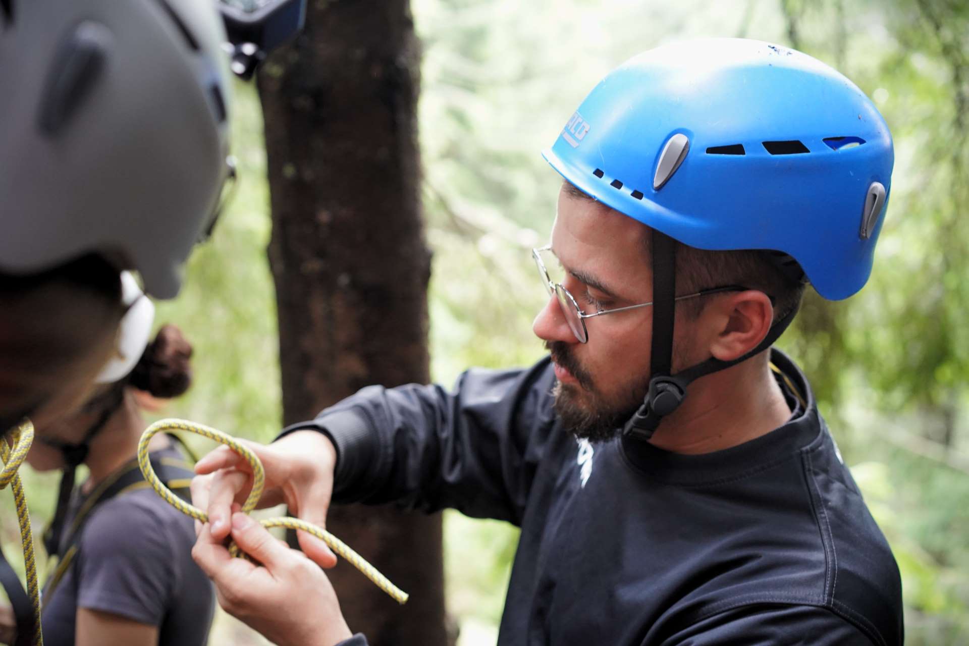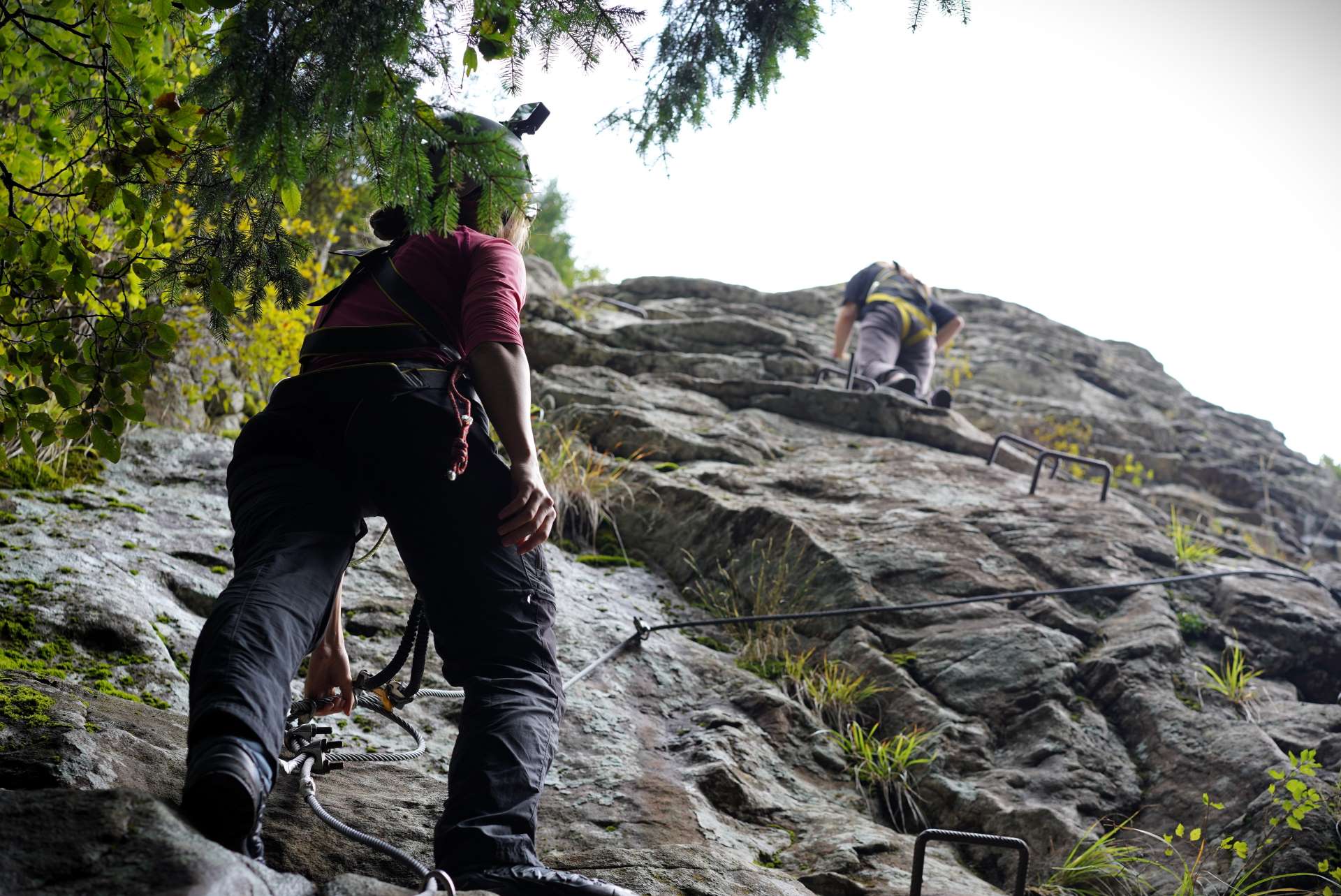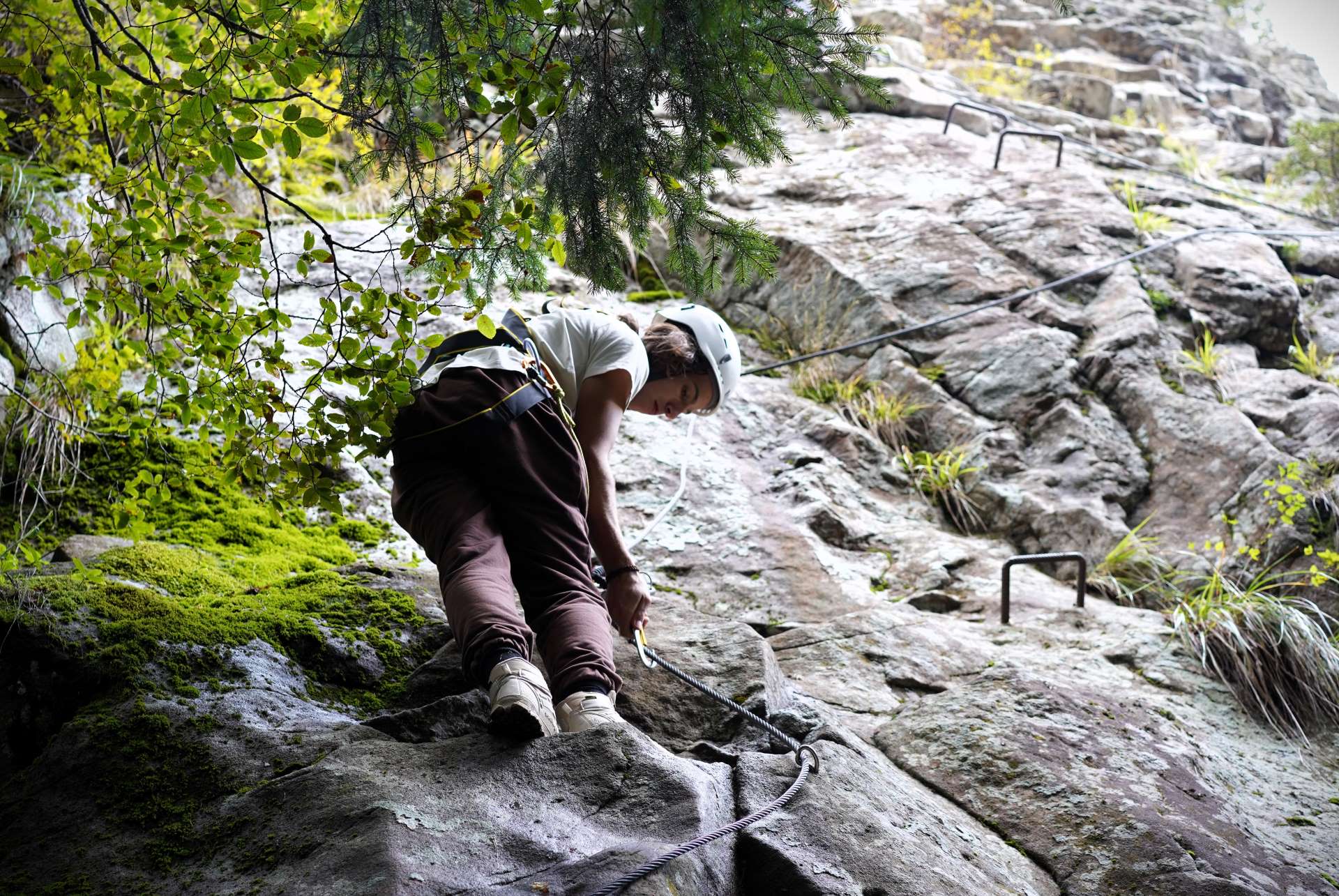 To start, Andreea and Pavel introduced the equipment and covered safety protocols. They demonstrated essential knots, like the double fisherman’s and prusik, to ensure each participant felt secure before the climb. Then, to meet everyone’s skill levels, they split the group. More confident participants started the route first, while others practiced knot-tying at the base with guidance.